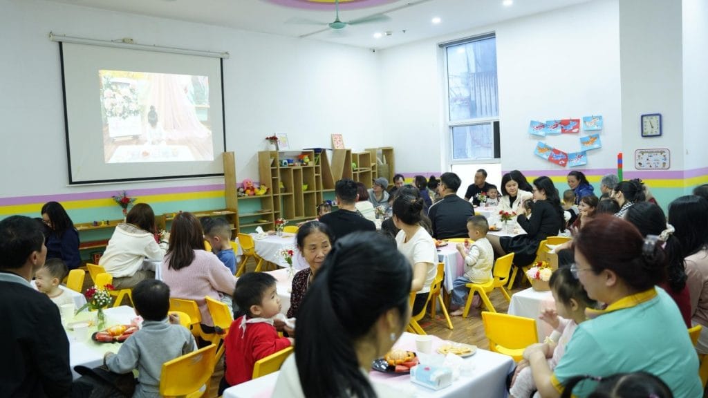 Đối với các em bé khối 0–3 tuổi, tuy còn nhỏ nhưng các con cũng đã chuẩn bị những món quà nhỏ xinh dành tặng bà và mẹ. Bên trong là những chiếc “dây treo điện thoại” đáng yêu mà các bé đã cùng cô giáo xâu trước đó. Trong buổi gặp gỡ thân mật, các con tham dự buổi lễ cùng bố mẹ và bà của mình, cùng nhau thưởng thức bánh ngọt, uống trà và xem những đoạn video ghi lại lời chúc vô cùng đáng yêu của các con. Những lời nói ngây thơ, trong trẻo của các bé đã mang đến rất nhiều niềm vui và sự xúc động cho gia đình.
