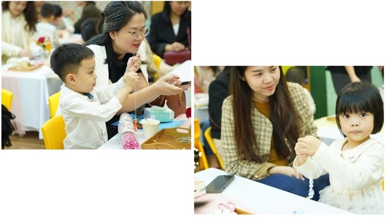 Đối với các bạn nhỏ khối 3- 6. Trong không khí ấm áp và tràn đầy niềm vui, các bé đã được cùng bà và mẹ tự tay xâu những chiếc “dây treo điện thoại” xinh xắn. Từng hạt cườm nhỏ được các con tỉ mỉ lựa chọn, xâu lại thành món quà đặc biệt – tuy giản dị nhưng chứa đựng tình yêu thương ngọt ngào của con dành cho bà và mẹ.