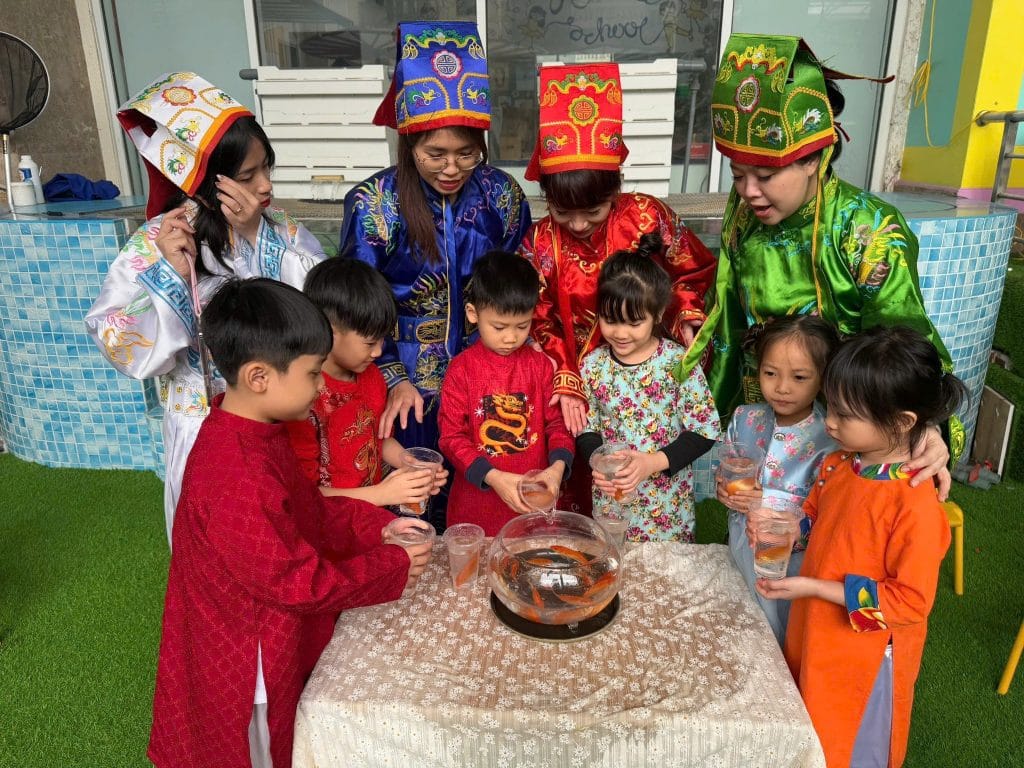Các con đã cùng nhau tham gia nghi thức thả cá chép – biểu tượng cho việc tiễn ông Công, ông Táo cưỡi cá chép về trời. Qua hoạt động này, các con không chỉ hiểu thêm về phong tục ngày 23 tháng Chạp mà còn học được tinh thần gìn giữ nét đẹp văn hóa truyền thống.