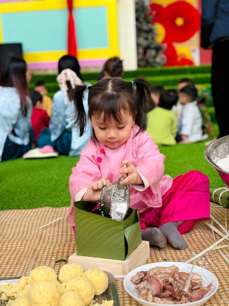 Dưới sự hướng dẫn của các cô, các bé đã được tự tay gói chiếc bánh chưng đầu tiên trong đời – chiếc bánh không chỉ là thành quả của sự khéo léo mà còn chứa đựng tình cảm để dành tặng ông bà, bố mẹ. Một món quà Tết nhỏ bé nhưng ấm áp vô cùng!