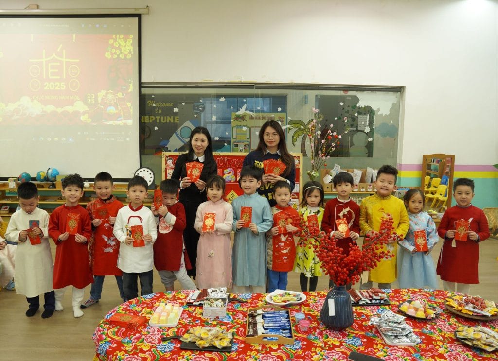 Không khí Tết càng thêm rộn ràng với hoạt động chúc Tết đầu năm. Các con gửi tới nhau những lời chúc tốt đẹp, cùng hát múa vui tươi và háo hức nhận bao lì xì đỏ thắm từ các cô giáo – kèm theo những lời nhắn nhủ dịu dàng: “Chúc con chăm ngoan, chóng lớn, học giỏi!”